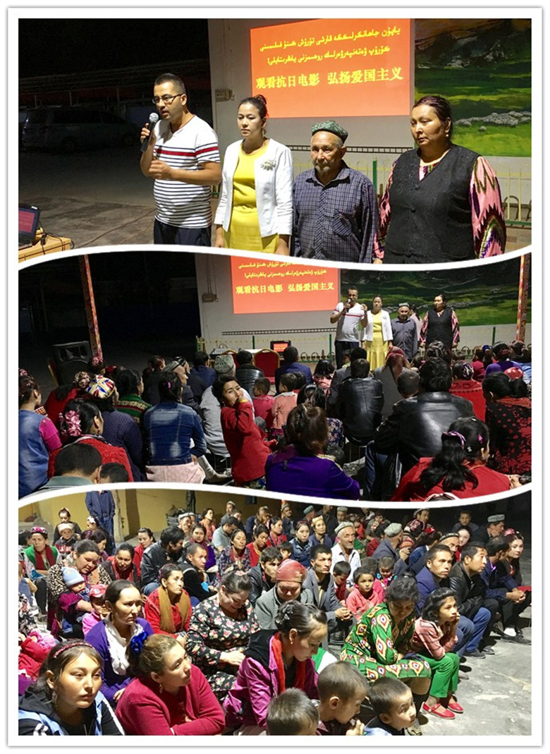 电影播放完毕后,村民党员阿卜杜力米提·买提尼亚孜带头登台,讲出了自己的观影感受:“共产党领导下的八路军,在日伪军的包围封锁下,面临重重困难,依然坚定抗日,绝不妥协投降,真的非常伟大!”村民布麦热姆·艾尔西丁说:“日本人烧火、抢光、杀光的政策实在太残忍了,我们要牢记这段历史,热爱自己的国家,捍卫来之不易的和平。”驻村工作队队员艾买提江·伟力向村民们简略的介绍了抗日战争时期,新疆虽身处抗战大后方,但各族新疆群众以满腔的爱国热情,通过伊犁、塔城等陆路通道将大批苏联、英美同盟国援华物资输送到抗日前线,并捐赠物资,参军杀敌,为抗日战争胜利作出重要贡献的光辉历史。驻村工作队副队长晓开提·依不拉音说:“9月3日是中国抗日战争胜利纪念日,9月18日时值“九一八事变”爆发86周年,我们即将迎来建国68周年华诞。此时,组织村民观看电影《百团大战》,就是要教育村民们铭记历史、缅怀先烈,传承和弘扬爱国主义精神;同时,教育村民们常怀感恩之心,珍惜强大祖国庇护下的幸福生活,做“知党恩、感党恩、跟党走、保稳定”的坚定拥护者和自觉实践者。”