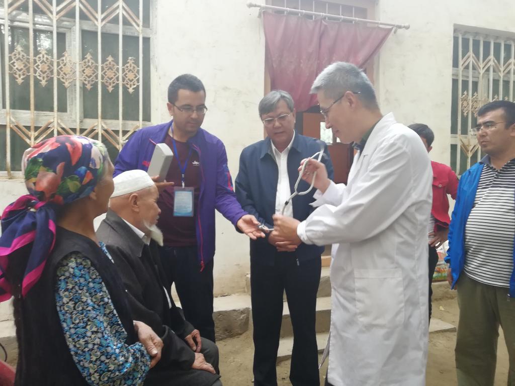 在扎瓦镇库提热木村,78岁的老人米热西木•卡斯木一只眼睛已经完全失明,他透过另一只眼睛微弱的光,看着眼前的高发水书记和医疗专家李风森大夫,满满的期待和渴望都写在脸上。李风森大夫仔细查看了老人的病历,为老人做了检查,建议老人要尽早动手术。高发水书记告诉老人的儿子艾哈买提江,老人要抓紧时间到医科大学附属医院就医,我们会安排最好的专家为老人治疗。艾哈买提江向高发水书记不停地表示感谢,他说自己专门放下了南京的烤肉生意回村给父亲治病。正发愁的时候,高书记带着医疗专家来到了家里,给家里解决了燃眉之急,真不知该如何表达自己的感激之情。高发水书记说,我们走村入户,就是要代表党委和政府来帮助老百姓解决实际困难,大家只要齐心协力一定会度过难关,只要跟着党走,就一定会过上好日子。