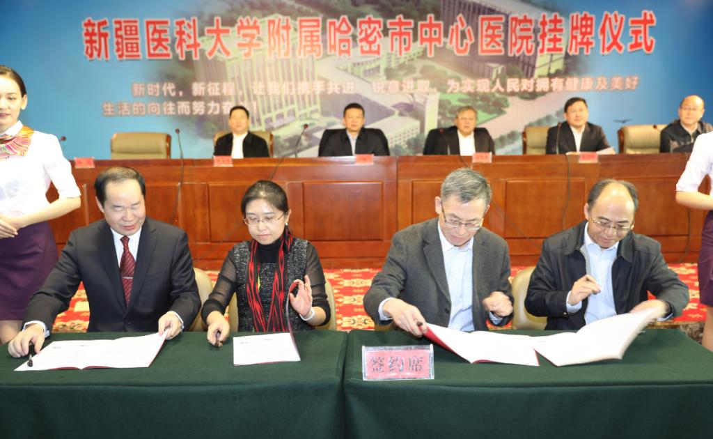 beat365在线唯一官网党委书记高发水和哈密市委书记卢蜀江共同为beat365在线唯一官网附属哈密市中心医院、beat365在线唯一官网哈密市中心医院临床医学院揭牌。