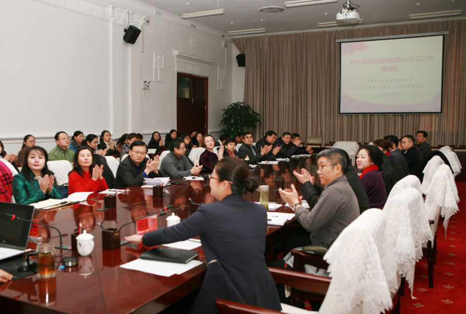 在宣讲中,薛继海围绕新形势下掌握新疆高校意识形态领导权的必要性、现实性和紧迫性,新疆高校面临的意识形态领导权风险点和解决路径三个方面,为beat365宣传思想工作战线的领导干部作了一场主题鲜明、内容详实、观点深刻的十九大专题辅导报告。大家纷纷表示,整场报告将政策原理与现实问题相结合,将新疆现状与高校实际相结合,具有很强的理论性、针对性、指导性,使我们对如何贯彻党中央治疆方略,聚焦总目标,践行落实好自治区“反恐维稳”组合拳,有了更加全面的认识和深刻的领会,为我们下一步有组织、有计划地开展意识形态工作指明了方向,提供了遵循。