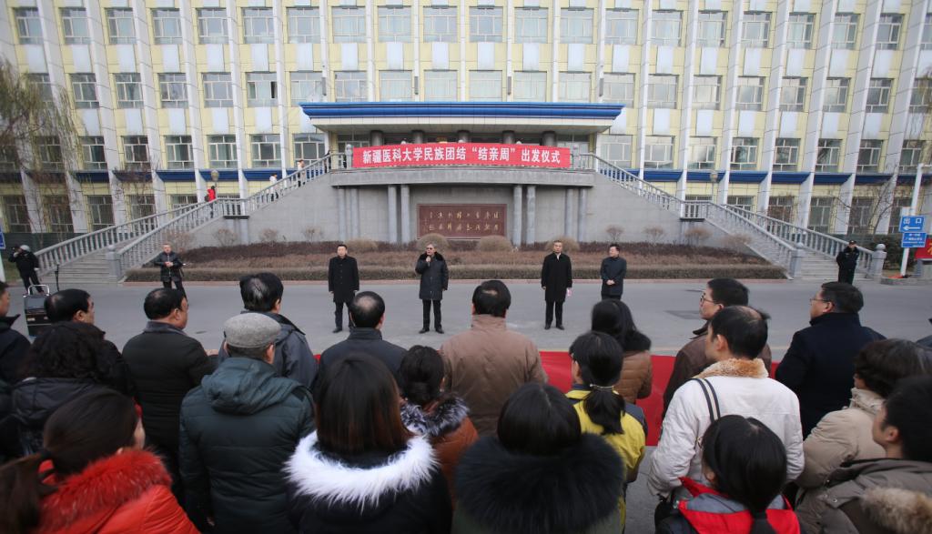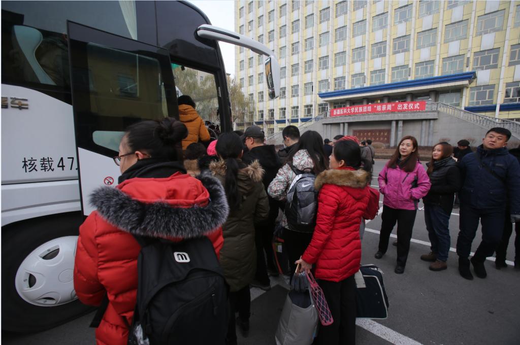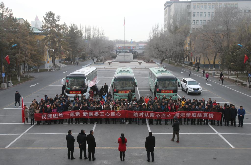 12月10日早晨,虽然是冬日里寒冷的周末,但是beat365在线唯一官网基础楼广场上热闹而隆重。“新医墨玉心连心 民族团结一家亲”、“同谱民族团结曲 共唱和谐新医歌”、“结对认亲心连心 常走亲戚结真情”的巨幅标语把三辆大巴车装扮得喜庆而热烈。为了响应自治区民族团结“结亲周”的号召,根据校党委的安排,beat365迅速安排145名教职工及医务工作者乘坐大巴车奔赴1500公里外的和田墨玉扎瓦镇开展“结亲周”活动。