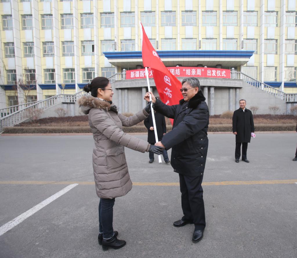 校党委书记高发水为校党委常委、宣传部部长赵翠芳授旗。在校党委副书记、校长凯赛尔•阿不都克热木“出发”的指令中,三辆满载着beat365145名教职工及医务工作者的大轿子车缓缓出发,驶向了和田墨玉县扎瓦镇。