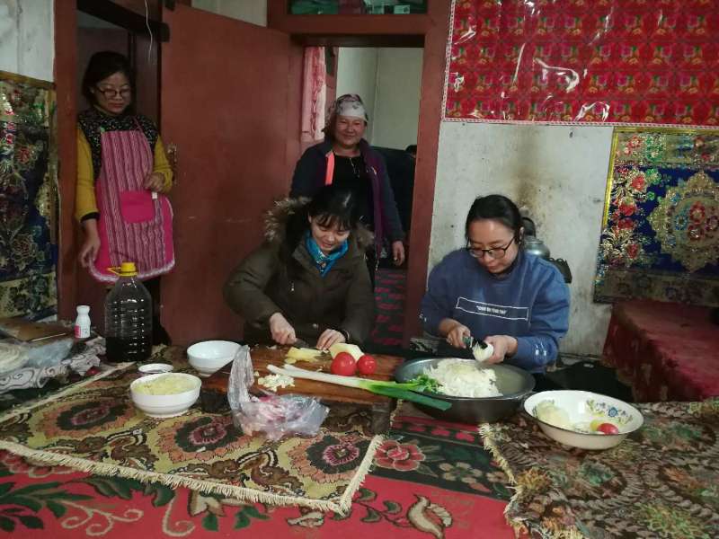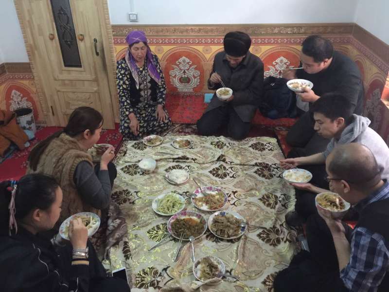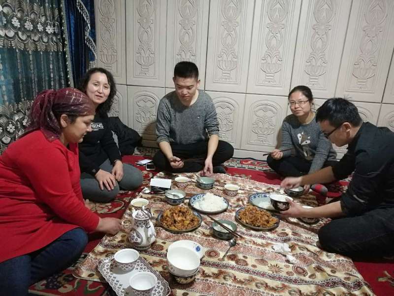 在扎瓦镇托格拉克麻扎村2组图尔荪尼亚孜·如孜的家,第五小组的木尼热·买卖提老师和组员们起床之后,开始帮着老乡家收拾房间,准备早餐。结亲干部们掏钱买了羊腿和亲戚一起做了香喷喷的拉条子,亲戚还特意打了香脆可口的包谷皮芽子馕,让结亲干部们的胃口大开。虽然有时,彼此间的沟通会存在困难,但一句简单的问好,一个信任的眼神,一个微笑的表情,彼此间的情谊便全都了然于心。