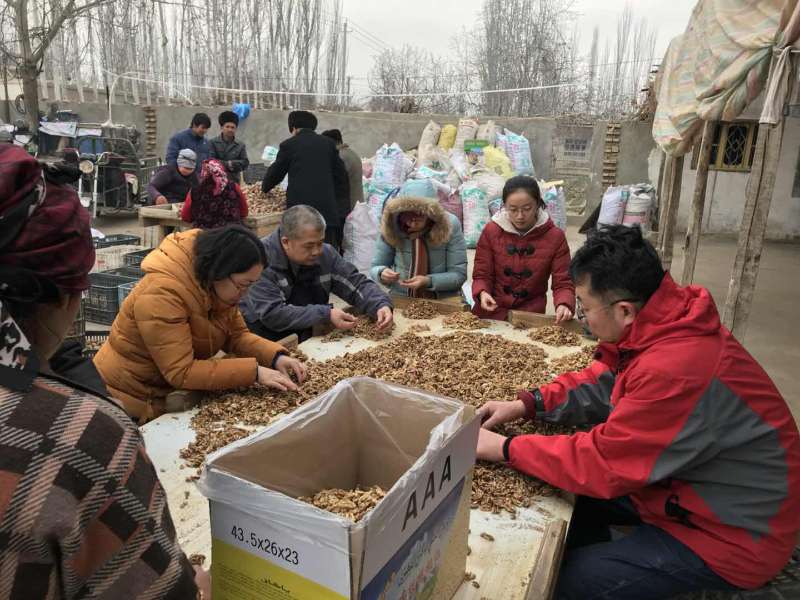 第7组6位成员昨晚到达后去亲戚家,我们的这位亲戚是老党员、村干部,对我们很热情,我们来之前,已经给我们准备好晚饭,我们一边吃饭,一边聊天。早上起来后收拾东西,吃完饭后女老师主动给亲戚家洗碗,打扫卫生,随后去亲戚家的儿子的核桃收购处,热情得帮亲戚分核桃仁,核桃仁按照完整性,颜色分三级,我们老师不顾外面冷,积极的给亲戚帮助分离分装。