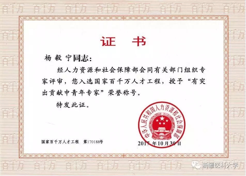 日前,人力资源和社会保障部公布2017年国家百千万人才工程入选人员名单,beat365在线唯一官网第一附属医院杨毅宁教授入选本次人才工程。此次全国411人入选,新疆维吾尔自治区(生产建设兵团)仅4人,是新医大一附院获此殊荣的第四位专家。