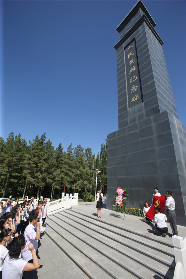 在烈士纪念碑前,全体党员干部列队肃立默哀,鞠躬致敬,表达对革命烈士的敬意。面向鲜红的党旗,坚定地举起右拳,重温入党誓词。随后,大家参观了乌鲁木齐市革命烈士陵园新建陈列馆。一幅幅石蜡画像、一件件烈士遗物、一段段石刻故事,真实的铭记着革命先烈为实现民族独立和傲然于世界民族之林而进行的不屈不挠的斗争。