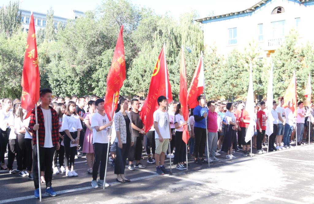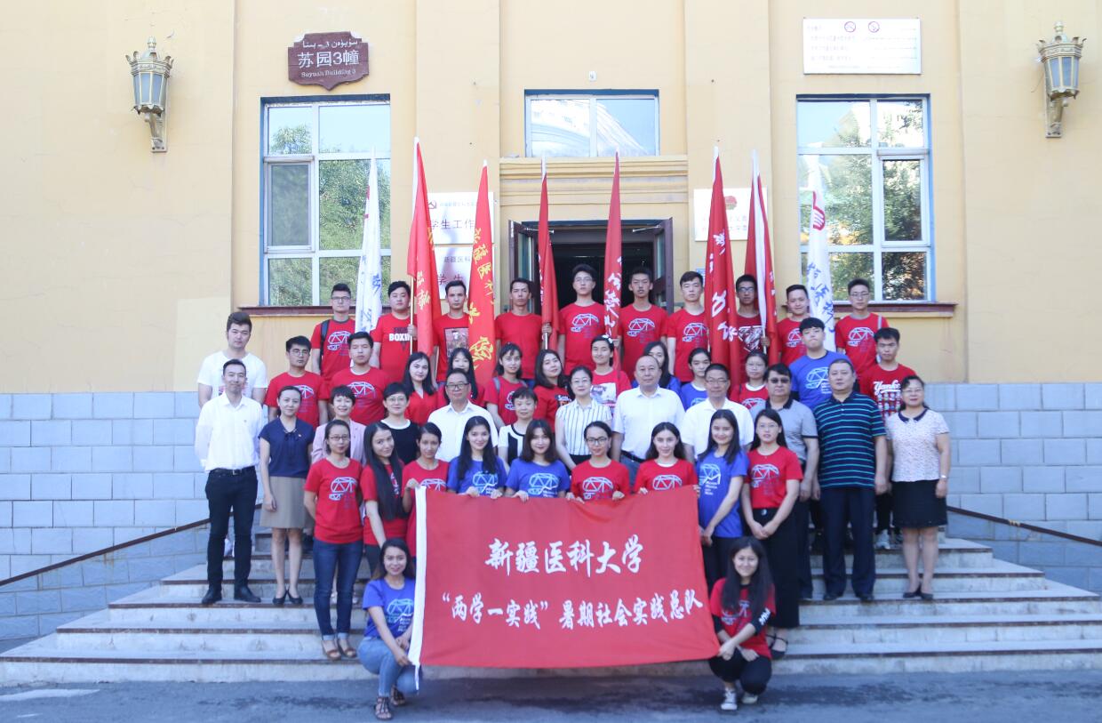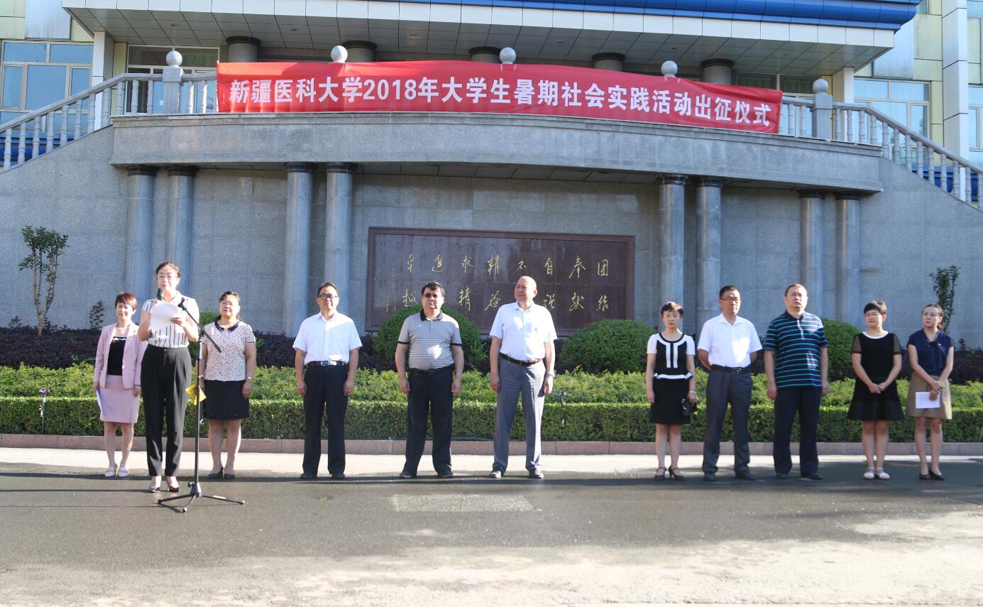 参加出征仪式的领导为实践队代表新疆学子百村行beat365在线唯一官网2018年大学生暑期社会实践总队、beat365在线唯一官网“两学一实践”暑期社会实践、beat365在线唯一官网第四届“互联网+”大学生创新创业大赛青年红色筑梦之旅、beat365在线唯一官网红领巾小课堂队旗和beat365在线唯一官网自治区第十九期青马班学员助力“访惠聚”社会实践专项活动五支代表队授旗。校级总队、院级分队共同挥舞旗帜,实践队员精神抖擞,现场气氛热烈。