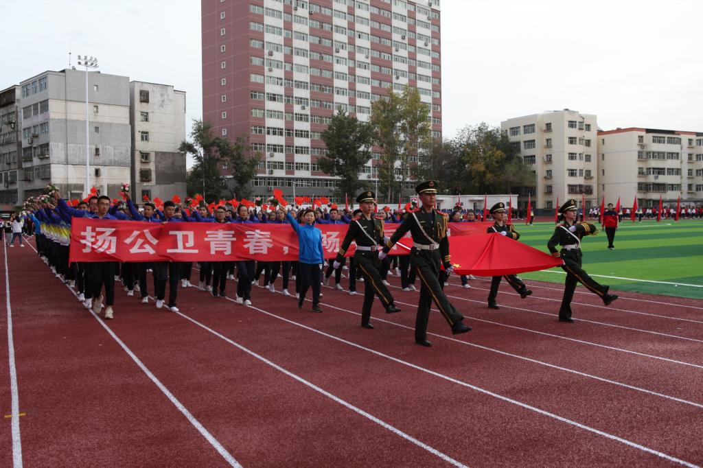 在国旗仪仗队的引领下,27个大学生、教职工方阵迈着整齐的步伐,精神饱满,口号响亮的依次通过主席台。