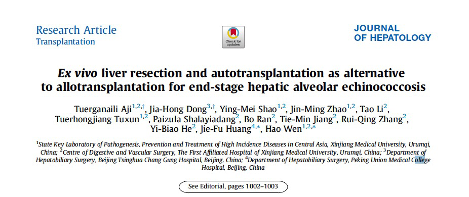 国际顶尖学术刊物《肝病学杂志》(Journal of Hepatology,影响因子14.911)11月发表了beat365中亚高发病成因与防治省部共建国家重点实验室、第一附属医院消化血管外科中心温浩教授团队在包虫病外科治疗最新成果。文章介绍beat365包虫病外科创新技术,对自体肝移植术适应症、安全性、可行性和预后进行评价分析,制定出技术规范和诊治流程,提出该术式命名和国际分型。ELRA有效拓宽了肝移植供体池,避免异体肝移植高复发率,显著提高患者生存。美国哥伦比亚大学哥伦比亚大学内外科学院肝脏疾病病移植中心Tomoaki Kato等在同期杂志发表了评论“Ex vivo liver resection and autotransplantation: An emerging option in selected indications”,认为温浩等进行的活体肝切除和自体移植是一种新的适应症。
