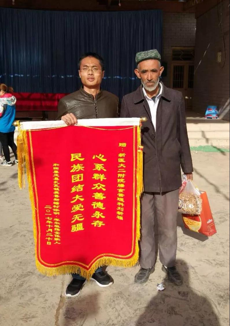 当年10月21日,当布萨依普•伊敏出院时,刘新福专门到火车站为她买了和自己去墨玉县结亲的同一趟列车,亲自把她送回家。在回家的路上,医院结亲队员们集体照顾她们,拿行李的拿行李,推轮椅的推轮椅,送吃的送吃的,经过一天的行程她们回到了英吾斯塘村的家和亲人们团圆了。伊敏•库尔班特地准备好了一面印有“心系群众、善德永存,民族团结、大爱无疆”字样的锦旗在英吾斯堂村村委会结对认亲活动现场送给了刘新福,伊敏•库尔班感动地哭着说:“女儿在乌鲁木齐看病期间,刘新福为我女儿的事情跑前跑后,在吃、住、行上都考虑的非常周到,他还带自己的妻子、女儿来病房看我们,我们就像一家人一样。女儿通过手术已经可以走路了,我要代表全家感谢beat365在线唯一官网“访惠聚”驻村工作队,感谢二附院领导、专家团队治好了女儿的病,你们都是好样的!”