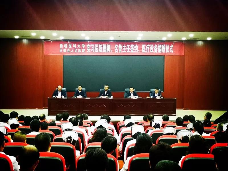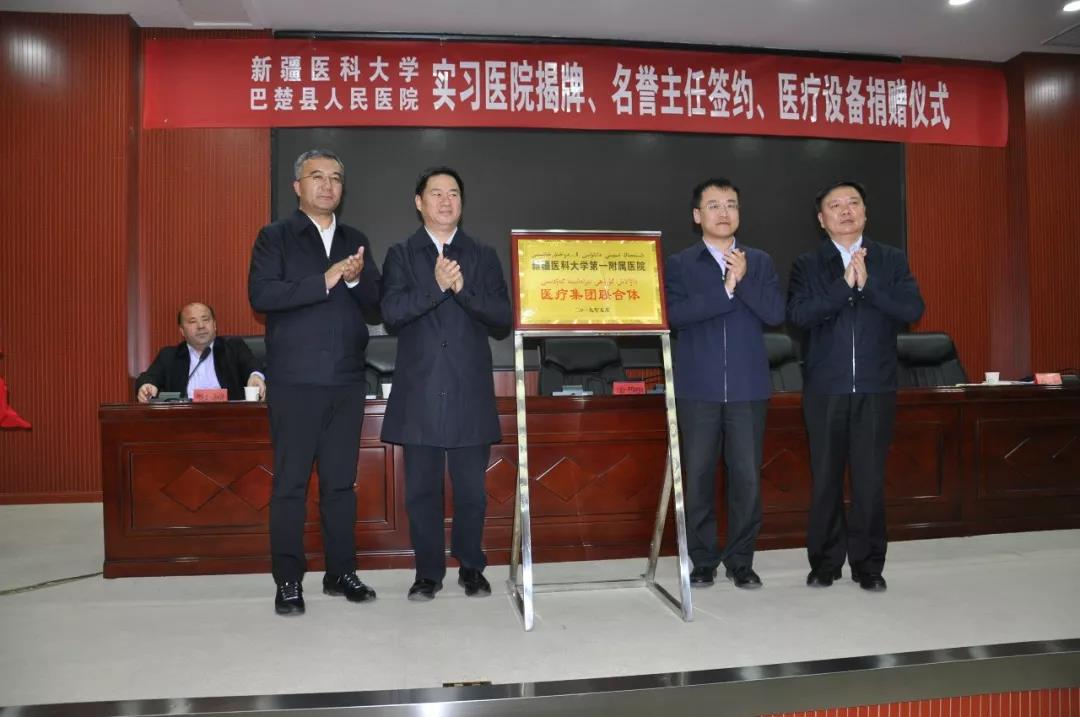活动中,凯赛尔·阿不都克热木校长与巴楚县党委书记药宁共同为“beat365在线唯一官网实习医院”揭牌;校党委常委、副校长贾文霄与药宁书记共同为“beat365在线唯一官网第一附属医院医疗集团联合体”揭牌;巴楚县人民医院院长吕红博与名誉主任代表签署受聘协议书,大会为11名名誉主任颁发了聘书,并举行了名誉主任师带徒拜师仪式。