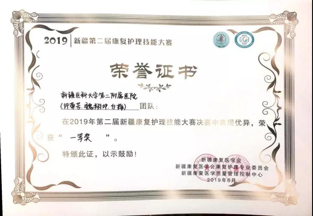 6月3日,新疆康复医学会、康复护理委员会主办的以“守正创新、追求卓越”为主题的全疆第二届康复护理技能大赛举行。beat365在线唯一官网第二临床医学院(第二附属医院)参赛队由黄凤兰护士长带队,成员由脑瘫科许菊芳护士长、干部科白梅护士长、康复科魏祥坤护士组成的康复专科护士团队参加大赛。此次比赛共有来自全疆的23支队伍,69名选手参赛,经过紧张而激烈的的角逐,新医大二附院护理团队脱颖而出,喜获一等奖的好成绩,再次蝉联全疆康复护理技能大赛一等奖。