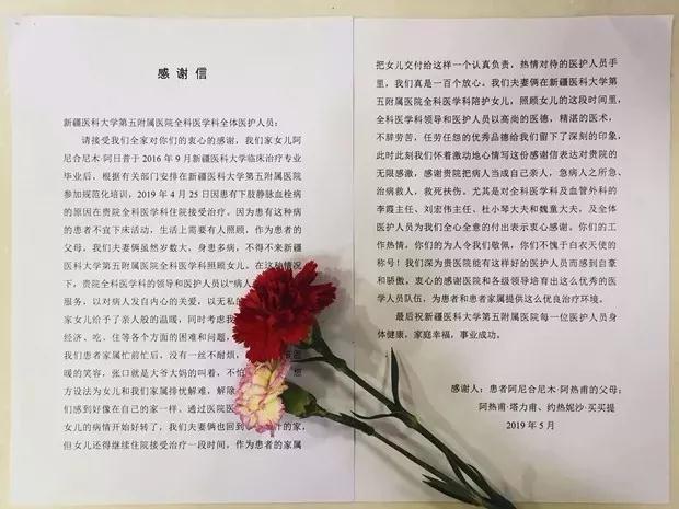 在感谢信里,阿尼的父母这样说到:“你们对病人发自内心的关爱,以无私奉献和无微不至的关爱,给予我家女儿亲人般的温暖,让我们印象深刻,无限感激。”面对阿尼及家人的这份感谢,第五附属医院全科医学科的医护人员们的内心受到了深深的触动。全科医学科主任李霞说,“我们只是做了医护人员平常该做的工作。阿尼既是患者又是医务工作者,她更能体会到医护人员的辛苦。这份认可对我们来说,弥足珍贵,也激励我们今后要更加尽心尽责,全心全意地为患者服务!”