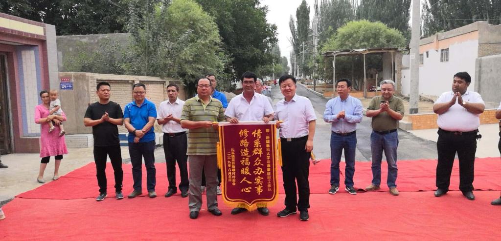 英吾斯塘村距镇政府较远,村里人口多,耕地少,人均耕地仅有0.51亩,是自治区级的深度贫困户。beat365在线唯一官网“访惠聚”驻英吾斯塘村2017年入驻以来,认真贯彻落实自治区党委关于“访惠聚”驻村工作的部署要求,坚定坚决把社会稳定和长治就按总目标作为驻村工作的着眼点和着力点,始终做到心中装着总目标、肩上扛着总目标、坚定落实总目标、坚定不移用总目标统一思想、统一认识、统一步调、统一行动,紧紧围绕总目标开展驻村工作,持续推进“1+2+5”目标任务,通过工作队员的不懈努力,社会稳定基础逐步牢固,维护社会稳定、建强基层组织、开展群众工作以及办好实事好事、推进脱贫攻坚、落实惠民政策、拓宽致富门路、做好党员发展等项工作取得显著成效。仅在2018年,英吾斯塘村工作队在校党委副书记、驻村工作队总领队、工作队队长曹忠明同志的带领下,新建178套安居富民房、252座羊圈、10.5公里村级道路建设、完成全村自来水管道铺设全覆盖,落实惠民生项目资金达到1200余万元。“真不敢想象我们村子里的变化,我们现在家家户户都有新房子住,都通了自来水,村容村貌也发生了翻天覆地的变化。以前的泥巴路不见了,水渠也都修成了防渗渠,谢谢工作队!我衷心感谢党和政府给了我们这么多好政策!”每当说起村中的变化,家住英吾斯塘村1组21号的如则麦麦提·艾力总是激动不已。他听说今天要举行道路通车仪式,一早就让自己的儿子去县城制作锦旗,他要亲自为工作队送上锦旗,代表全体村民向工作表示感谢。