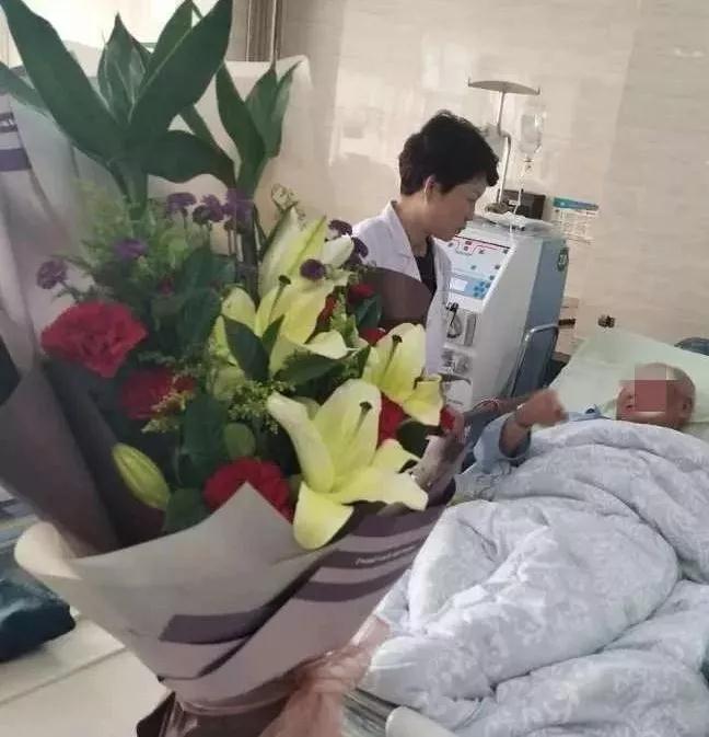 10月9日这天,老人像往日一样安安静静躺在病床上一边闭目养神一边接受着治疗。透析大厅突然传来一阵喧哗:“好漂亮的鲜花呀,哪里来的鲜花?”老爷爷闻声,睁开眼睛看到肾病科主任张蕾和透析室护士长张翠萍,捧着鲜花向他走来。