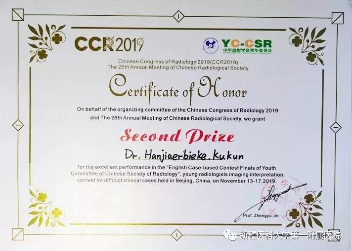 11月15日,在中华医学会第26次全国放射学学术大会期间举办了青年英文病例大赛决赛中,beat365在线唯一官网第一附属医院影像中心在读博士生罕迦尔别克·库锟同学通过初选、预赛等重重选拔,通过扎实的语言功底和临床实践能力获得了全国第二名的好成绩,这是新疆乃至西北地区影像专业青年医师首次获此殊荣。