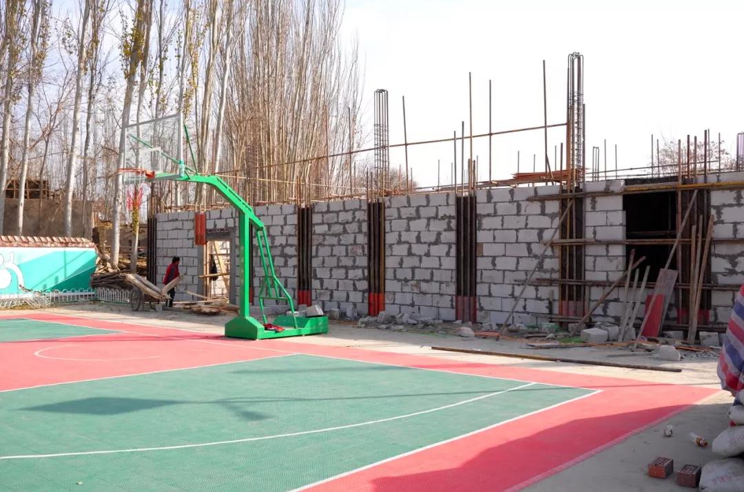 塑胶篮球旁正在建设的电影院