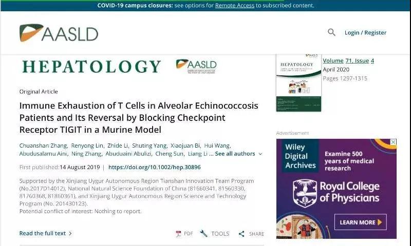 《Hepatology》是全球权威的肝脏病学期刊。该论文经过长达4年的研究总结,揭示了泡型包虫病发生发展过程中抑制性受体TIGIT可导致T细胞耗竭,证明抗TIGIT单抗可逆转T细胞耗竭并用于包虫病的免疫治疗,填补了T细胞研究领域的空白。