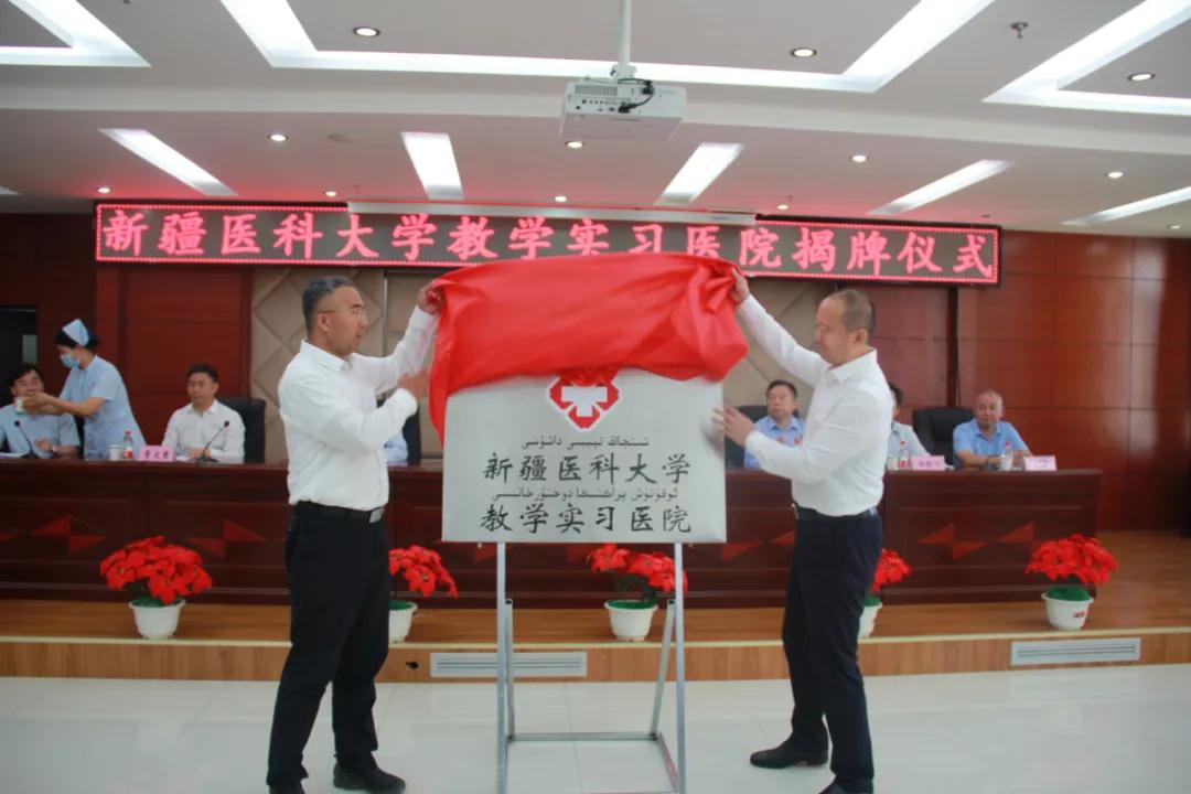 凯赛尔·阿不都克热木校长与奇台县委书记马旭东共同为“beat365在线唯一官网教学实习医院”揭牌。
