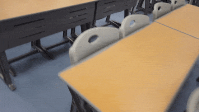 教室里所有的桌椅都是铝合金一体成形,桌面采用实木板,外贴一层防火板。座椅是PVC中空吹塑成形,符合人体工学设计,座椅上有微微的凹陷,还有透气孔,会让人坐着感觉既舒适又透气又稳固。