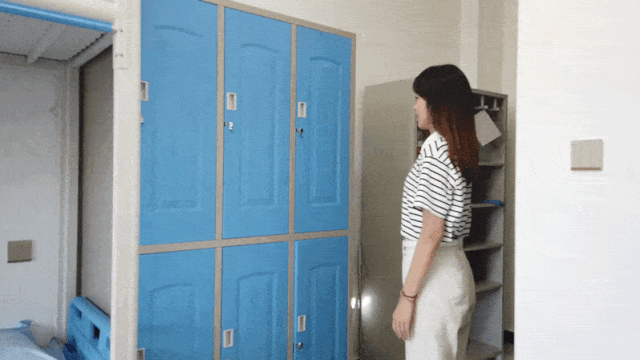 行李架与同学们过去公寓里的有一些不同,多了一个专门放置鞋子的格挡,再也不用把鞋子堆放在床下了。储物柜设计为六门,每位学生都有自己专属的储物空间,柜门是双层设计,更厚重和结实。