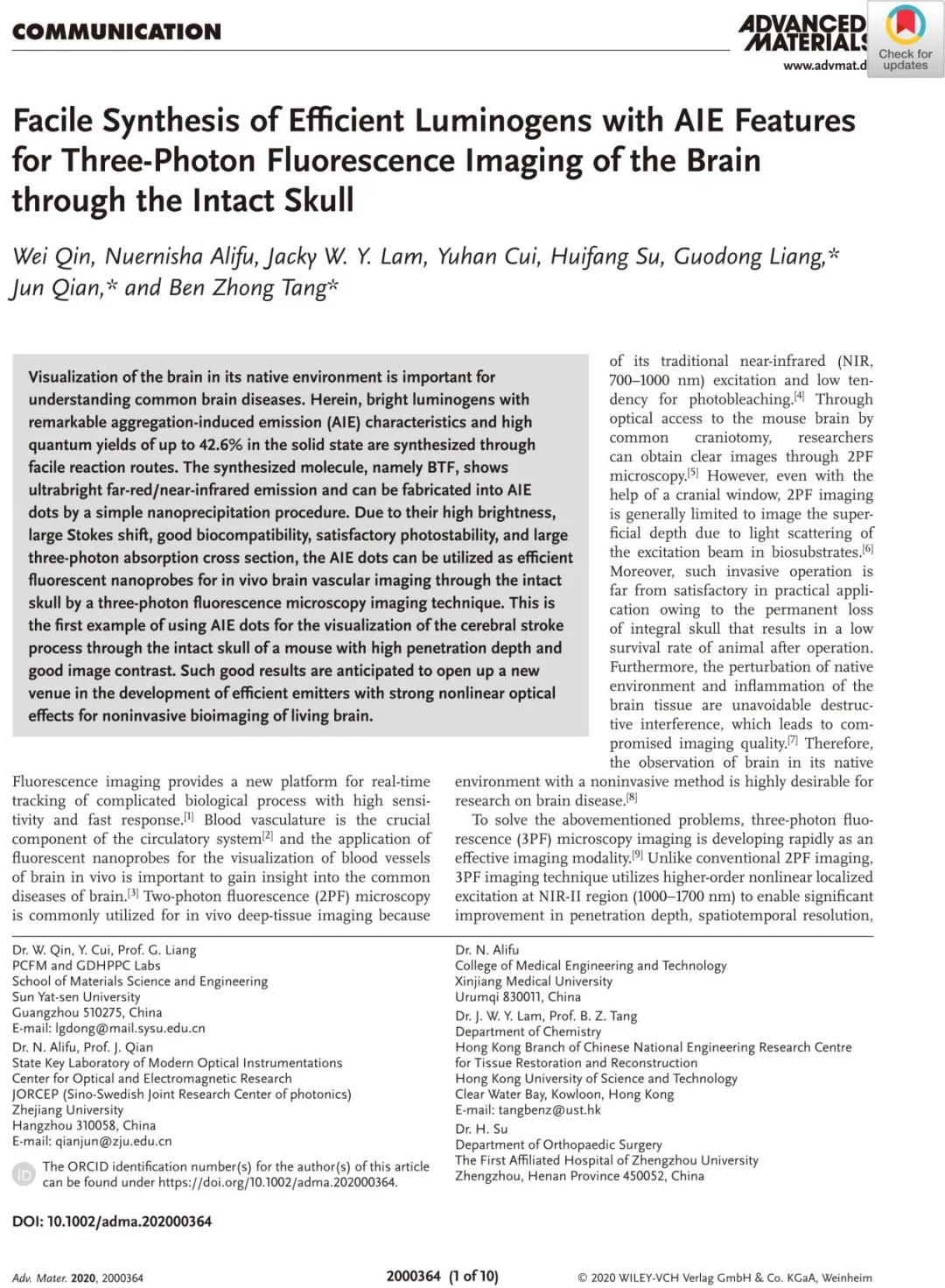 在此之前的5月1日,努尔尼沙·阿力甫博士与浙江大学钱骏教授研究团队及香港科技大学唐本忠院士研究团队、中山大学梁国栋副教授合作,作为共同第一作者在《Advanced Materials》上发表了题为“Facile Synthesis of Efficient Luminogens with AIE Features for Three‐Photon Fluorescence Imaging of the Brain through the Intact Skull”的文章,报道了他们在3PF成像有机染料方面的进展。利用具有高亮度、大Stokes位移、良好的生物相容性、良好的光稳定性和大的三光子吸收截面的AIE纳米材料作为一种有效的荧光纳米探针,通过三光子荧光显微成像技术对完整的颅骨进行活体脑血管成像。这是首次使用AIE点通过完整小鼠颅骨来可视化脑卒中过程的例子,且具有高穿透深度和良好图像对比度。《Advanced Materials》为国际材料科学领域权威期刊,其2020年最新影响因子IF=27.398。