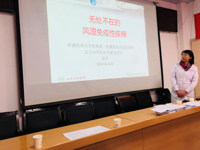 在“走出去,引进来”这一理念的引导下,徐东主任通过援疆工作,搭建了beat365在线唯一官网第一附属医院与北京协和医院合作交流平台,邀请北京协和医院风湿免疫科专家来疆授课,与疆内风湿免疫同行现场答疑交流,扩大了医院风湿免疫科在疆内风湿病领域的影响力。同时协调科室临床医生共同参加了2019年北京协和医院风湿免疫科举办的学习班培训,现场与专家交流互动,相互学习、共同提高,促进新疆地区风湿免疫学科发展。