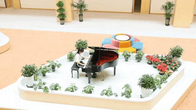负一层的景观中庭,作为图书馆的“绿色心脏”,环境优美,阳光、绿植、鲜花交相映衬,置身中庭犹如处在大自然之中,钢琴元素的存在,增加了景观中庭高雅的文艺气息。作为馆内一个独特的多元化活动空间,这里也是师生读者休憩、观赏和交流的场所。