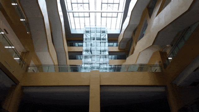 整座图书馆,最吸引人的地方,就是中庭的区域。这里视野开阔,既可以仰视天空,也能将负一层的景观区尽收眼底。房顶采用的是玻璃和钢结构的天花板造型,让光亮可以充分地照进馆内。即使在阴天,室内的光线也十分充足,最大限度地体现了节能的建筑特点。中庭两侧错落有致的台阶点缀,二层至六层的观光电梯,为中庭增加了灵动和美感。