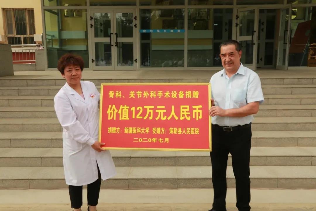 马江山书记为“名誉院长”、6名“名誉主任”颁发了聘书,并举行名誉主任师带徒拜师仪式。第一附属医院骨科中心关节外科主任阿斯哈尔江·买买提依明向策勒县人民医院捐赠了价值12万元的医疗器材。
