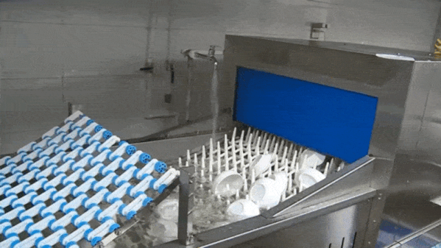 在海棠餐厅的负一层,餐具在这里被集中清洗消毒。长龙式洗碗机上,碗碟经过除渣、消毒、超声波清洗、二次清洗等一系列洗涤流程,实现了预洗、洗涤、漂洗、灭菌一步到位。筷子和勺子也都有专属的清洗设备,餐具的洗消更加规范、卫生和安全。