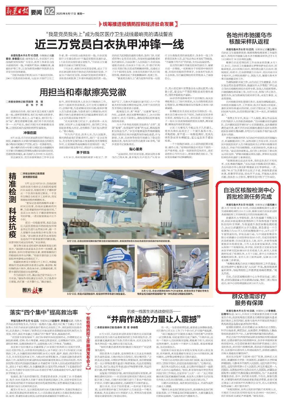 8月7日至16日15时,自治区核酸检测中心累计完成核酸检测约310万人份,顺利完成了自治区新冠肺炎疫情防控工作指挥部交付的首批检测任务。今天,自治区各主要新闻媒体对此进行了重点报道。