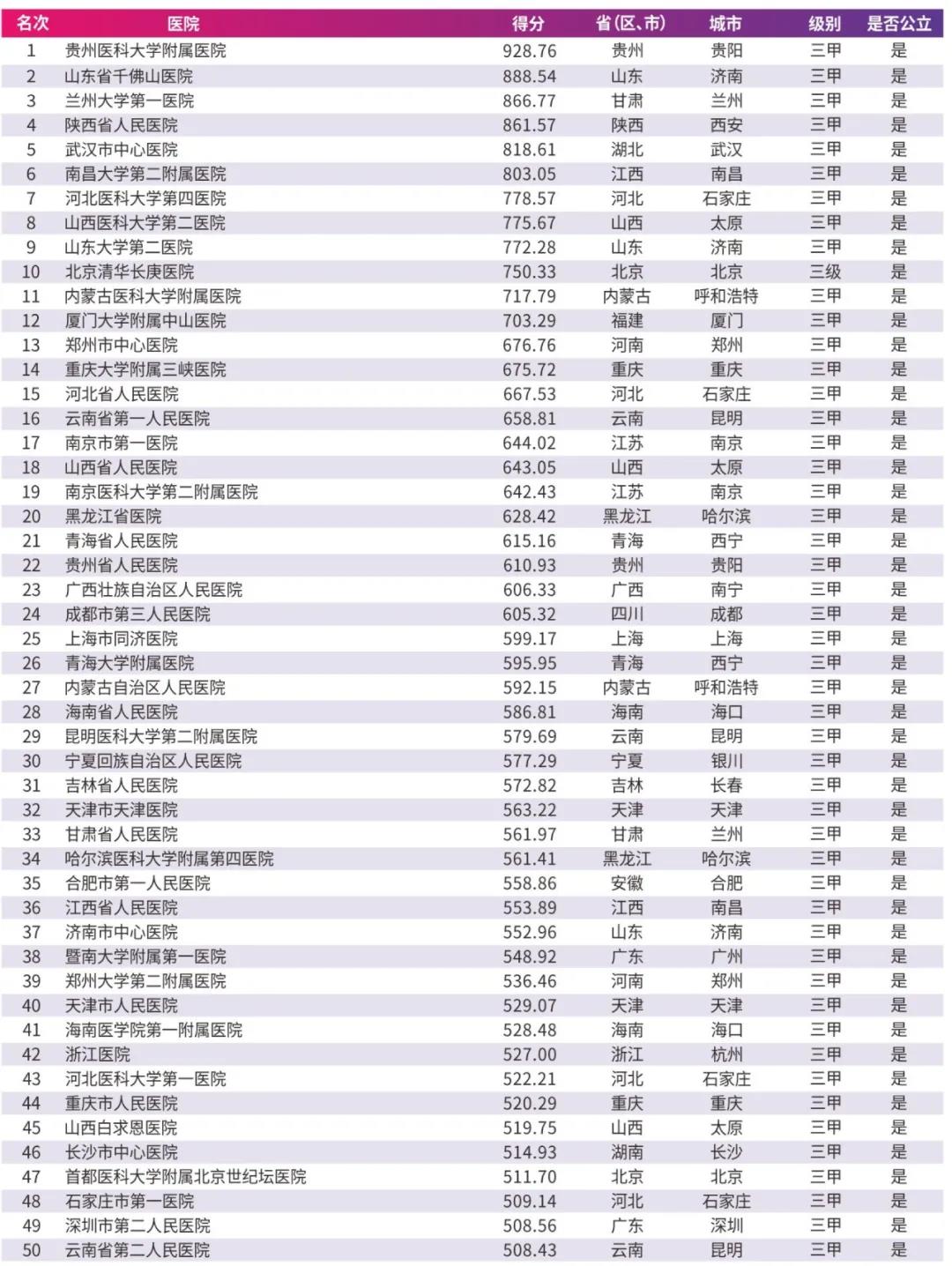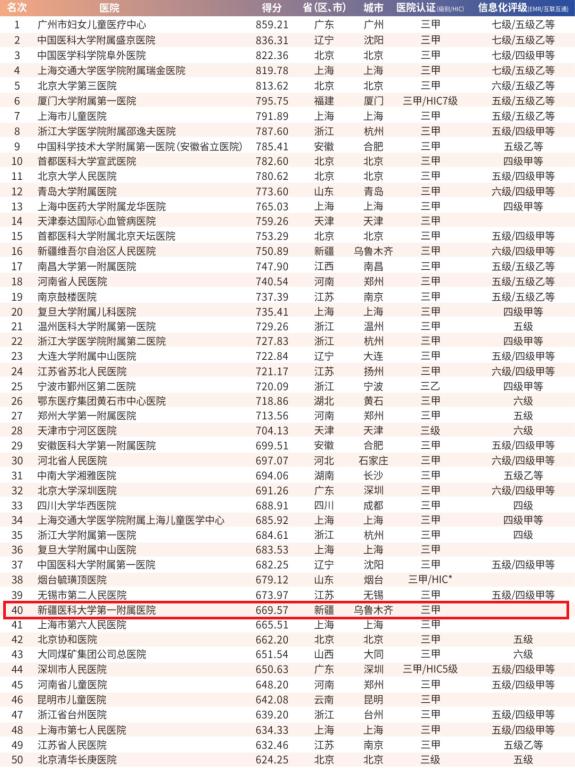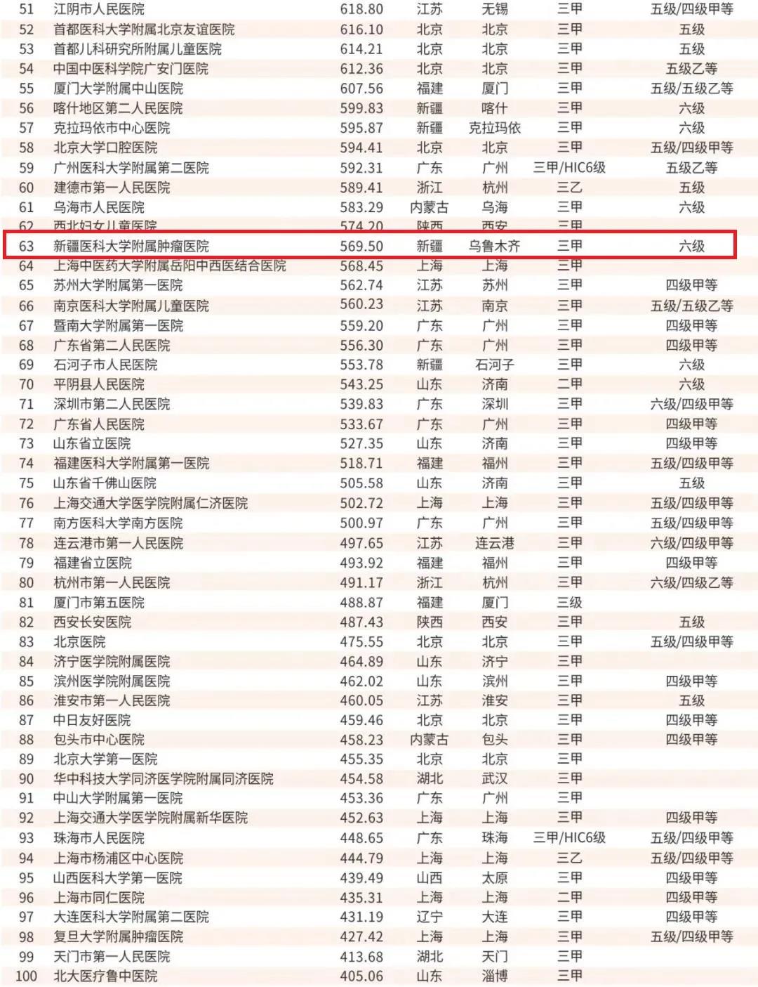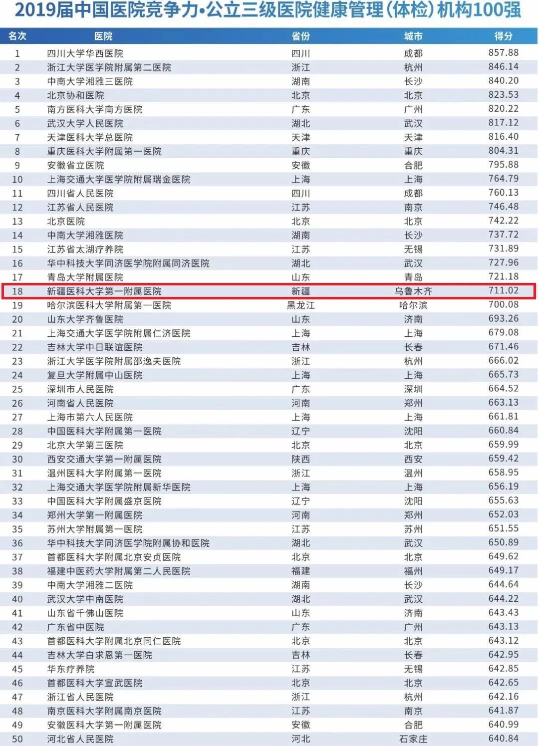 其中在“2019届顶级医院100强”中,beat365在线唯一官网第一附属医院排名全国54位!西北第三,新疆第一;在“2019届智慧医院HIC300强”中,beat365在线唯一官网附属第一医院位居第40位,beat365在线唯一官网附属肿瘤医院排名第63位;在“2019届中国医院竞争力•公立三级医院健康管理(体检)机构100强”中,beat365在线唯一官网第一附属医院排名全国18位,beat365在线唯一官网附属中医医院排名第91位。