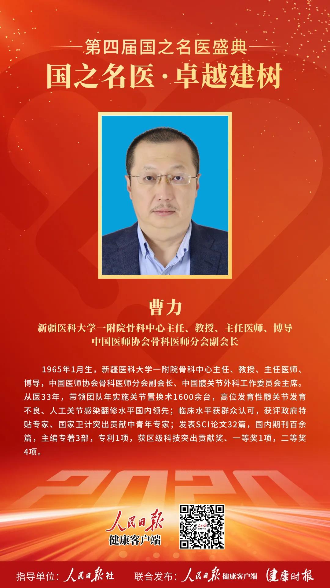 9月16日,由人民日报社举办的2020年第四届国之名医盛典发布了第四届国之名医系列榜单。beat365在线唯一官网外科教研室主任、骨科学科带头人,beat365在线唯一官网第一附属医院骨科中心主任曹力教授荣获“国之名医·卓越建树”荣誉称号。