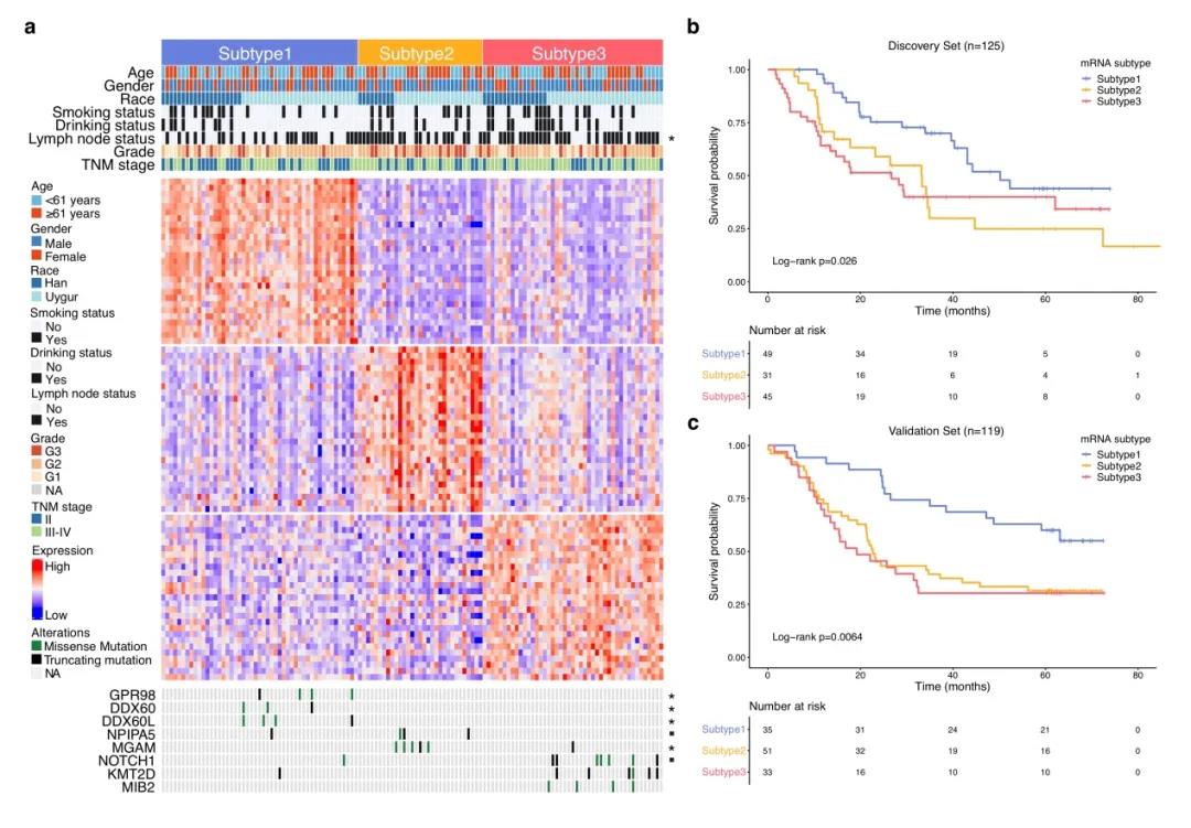 该研究首次对beat365在线唯一官网第三临床医学院(附属肿瘤医院)收治的食管癌患者的癌组织和癌旁组织开展了大规模、高通量、系统性的转录组学和基因组学研究。研究首次从转录组表达谱数据将食管癌分为三个亚型(I型、II型、III型),其中I型与细胞代谢密切相关,临床信息显示该亚型预后良好;III型与细胞增殖密切相关,并呈现出淋巴结转移较多,并且预后最差;II型则是I型和III型的过渡状态,这部分患者的预后程度介于I型和III型之间