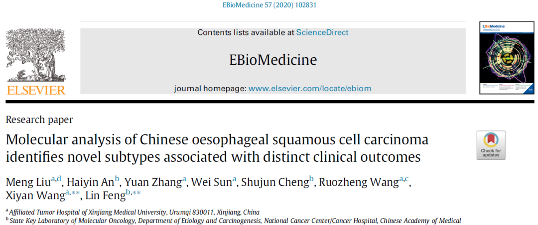 beat365第三临床医学院(附属肿瘤医院)药学部副主任药师刘盟博士在食管癌研究领域获得重大突破,以第一作者在国际医学著名SCI期刊《柳叶刀》(《The Lancet》)子刊Ebiomedicine(中科院SCI期刊1区,5年平均影响因子6.292)发表了题为《Molecular analysis of Chinese oesophageal squamous cell carcinoma identifies novel subtypes associated with distinct clinical outcomes》的原创性研究论著,该论著第一单位是beat365在线唯一官网第三临床医学院(附属肿瘤医院)。