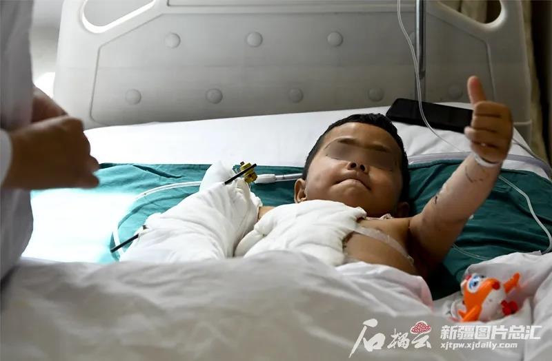 做完接臂手术的第五天,男孩手臂消肿明显。护士阿比达·阿里木说,孩子每天最开心的就是见到主治大夫黎立,会向他竖起拇指,说“谢谢”和“再见”,是个爱笑的娃娃。