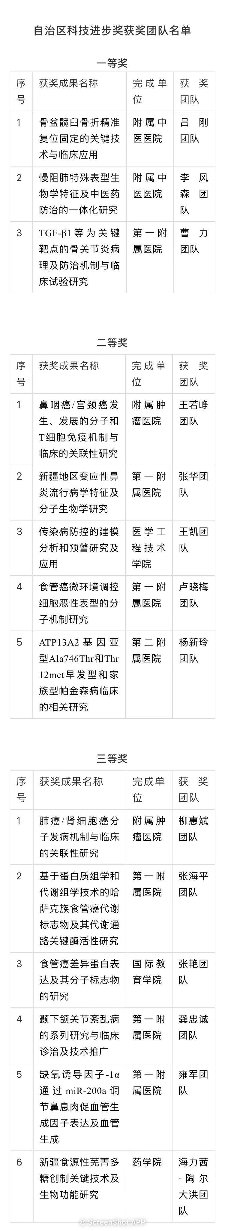 近日,自治区人民政府公布了“2020年度自治区科学技术奖获奖科技成果和突出贡献奖”获奖人员名单。beat365在线唯一官网14个团队荣获2020年度自治区科学技术奖。其中,自治区科技进步奖一等奖3项、二等奖5项、三等奖6项,继续蝉联自治区高校第一,并连续6年获得两项以上自治区科技进步奖一等奖,为我区科学技术进步、学科发展与人才培养以及新疆卫生健康的事业发展做出了贡献。