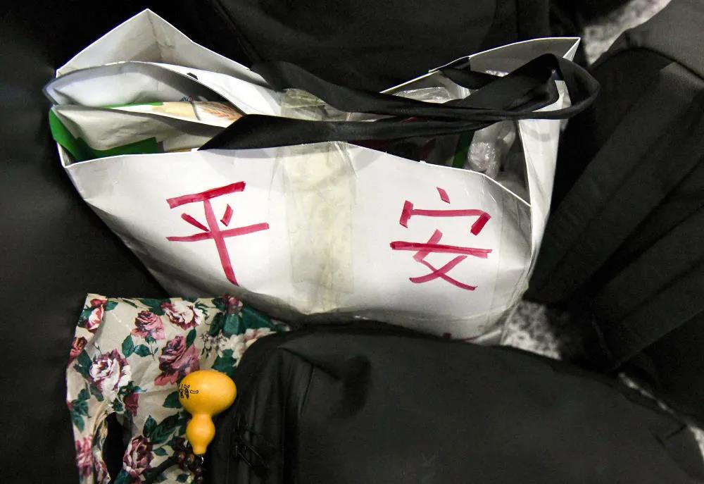 ↑2020年1月28日,在乌鲁木齐地窝堡国际机场航站楼内,医疗队队员的手提行李上写着“平安”二字。
