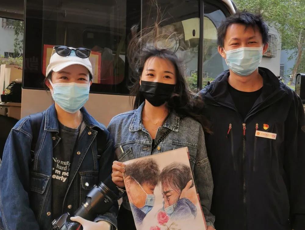 ↑2020年4月23日,再次见到吕俊与王鹤时,新华社记者王菲(左)将自己绘制的画作送给他们作为纪念。