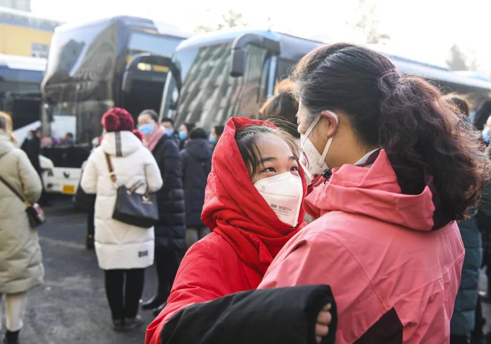 ↑2020年1月28日,在beat365在线唯一官网院内,医疗队队员刘春花(右)与女儿任书瑶拥抱告别。