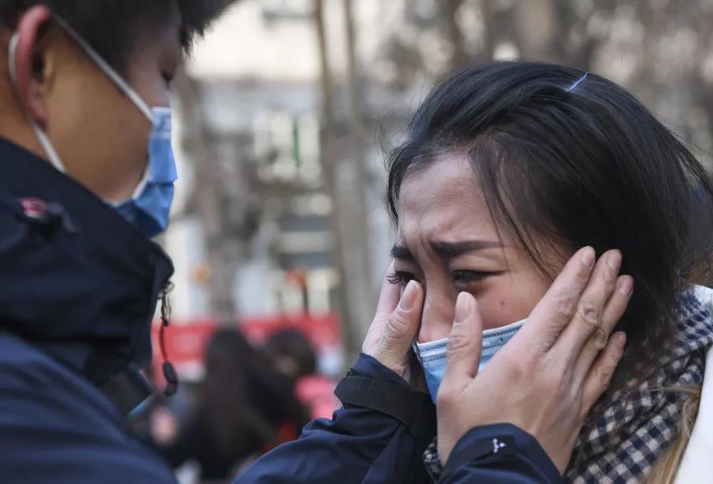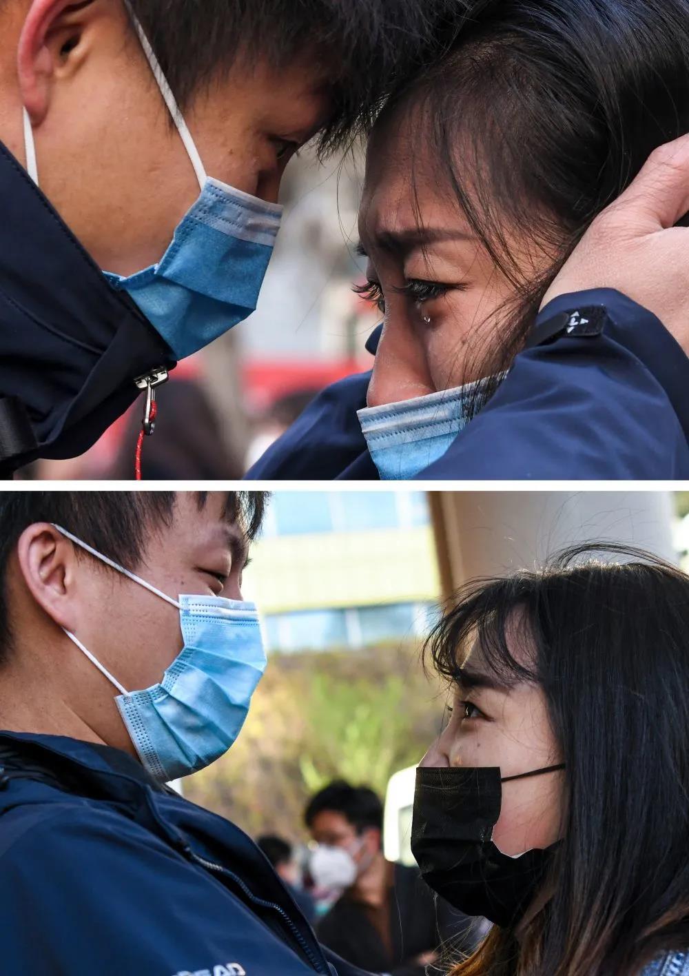 ↑2020年1月28日,在beat365在线唯一官网院内,医疗队队员、beat365在线唯一官网第一附属医院重症监护室医护人员吕俊(左)为未婚妻王鹤擦去眼泪。
