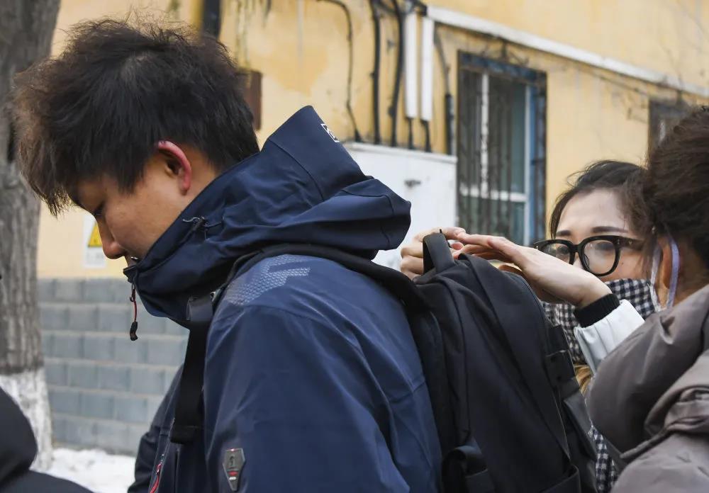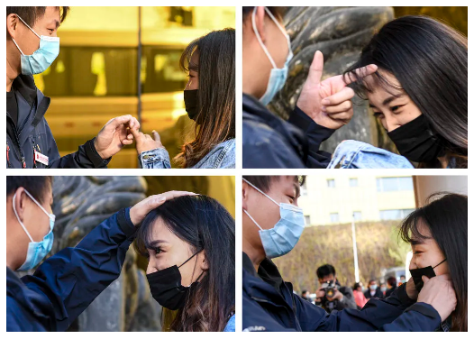 这时,我发现人群中两位年轻人依依不舍,小伙子是医疗队员,小姑娘一直挽着他的手跟他交流,一会儿帮小伙子整理外套拉链,一会儿又给小伙子的行李中塞进一包药,小伙子则时不时拥抱安抚小姑娘。两人言语不多,但眼神中写满了坚定。我被他们面对疫情时勇于奉献的战斗精神所感动,我立刻拿起装着长镜头的相机,远远地将镜头推向二人,生怕打扰到他们。