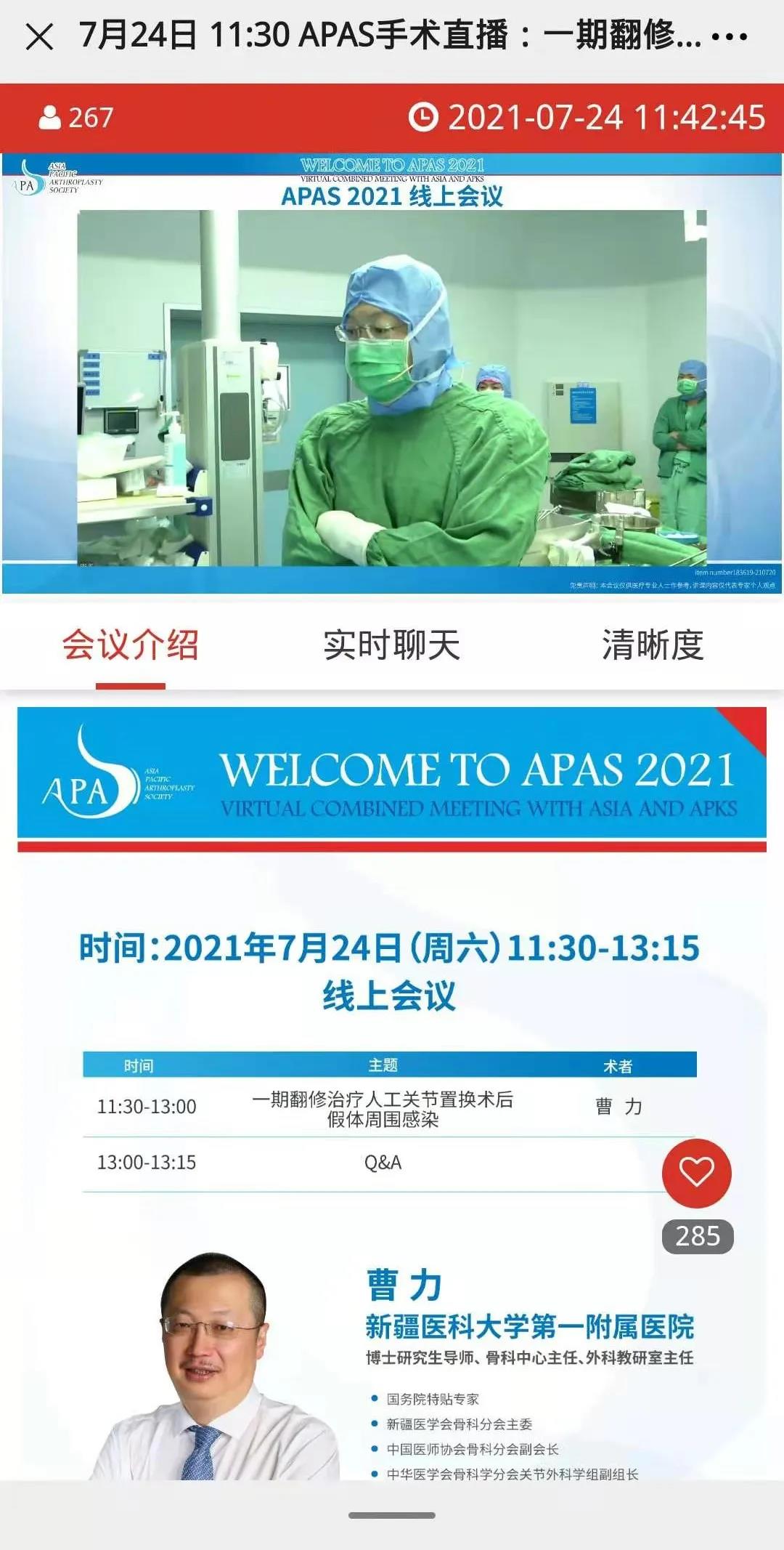 近日,2021亚太关节外科学会年会(APAS2021)于7月在线隆重召开。会议期间,由beat365在线唯一官网第一临床医学院(第一附属医院)和北京积水潭医院代表中国医疗团队,分别开展了一台关节翻修术的全网手术实况直播,向世界分享展示了中国人工关节置换先进经验。曹力教授带领团队实施的一台髋关节置换术后感染一期翻修手术,表明了beat365在线唯一官网第一临床医学院(第一附属医院)关节外科团队在人工关节翻修治疗方面已走到世界前列。