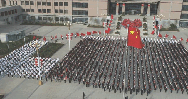 “升国旗,奏唱国歌!”在雄壮的《义勇军进行曲》中,五星红旗冉冉升起、迎风飘扬。全体师生肃立挺拔,向国旗行注目礼,齐唱国歌,浓烈的爱国情怀在师生们心中升腾、激荡。