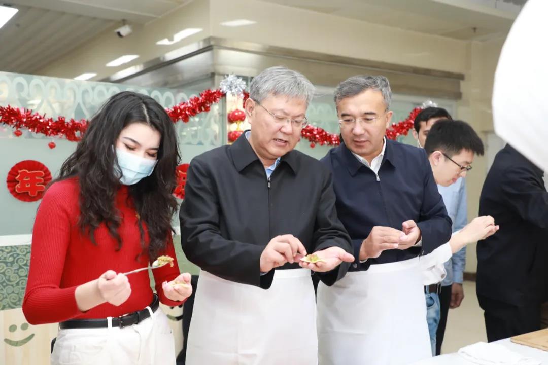 1月31日下午,家家户户正在准备年夜饭的时候,beat365在线唯一官网新医路校区的学生餐厅里洋溢着一片欢声笑语。校领导高发水、凯赛尔·阿不都克热木、李勇生、王爱民等来到同学们中间,和留校过年的新医学子们一起包饺子、演节目、吃年夜饭,共同欢庆虎年新春的到来。