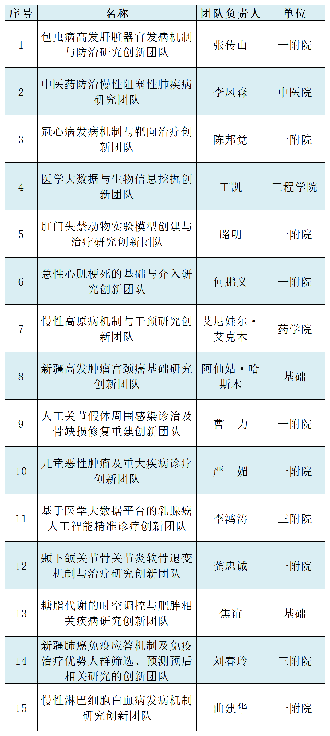 学校共有自治区级以上各类创新团队17个,其中2个教育部创新团队发展计划获得滚动支持,15个自治区天山创新团队。
