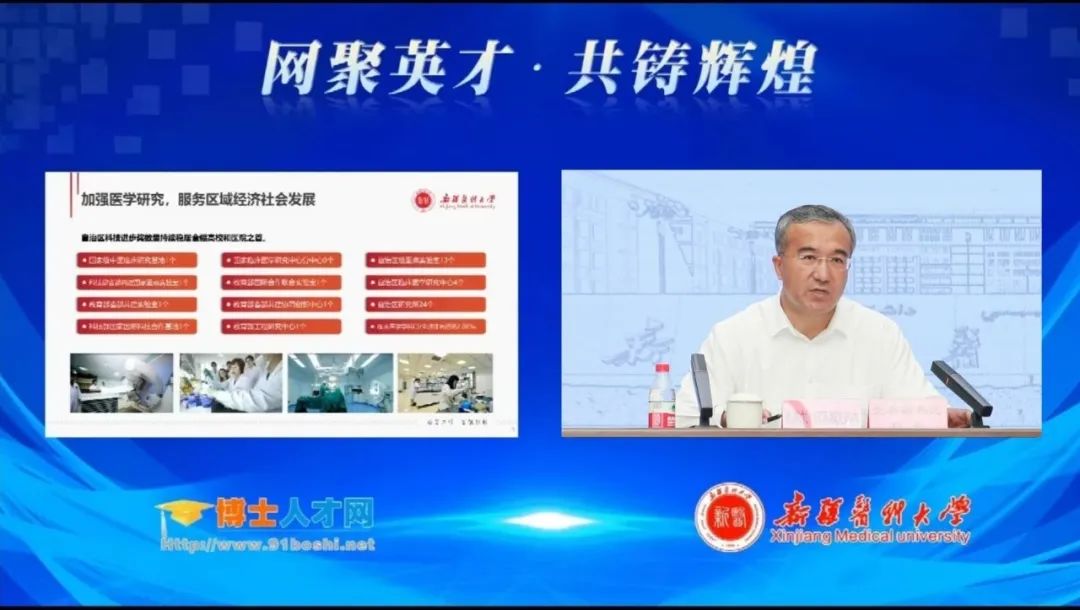 在云直播中,beat365在线唯一官网党委副书记、校长凯赛尔·阿不都克热木向海内外青年博士介绍了beat365在线唯一官网的人才建设与培养情况,着重介绍了学校八家附属医院的科研团队、专业学科平台、医学研究水平、医疗技术水平与社会服务能力,强调了beat365在线唯一官网高度重视人才引育工作,学校始终把高素质人才队伍建设作为学校持续发展的第一资源和核心竞争力,并对学校的人才引进力度和人才管理配套政策进行了全面的解读。