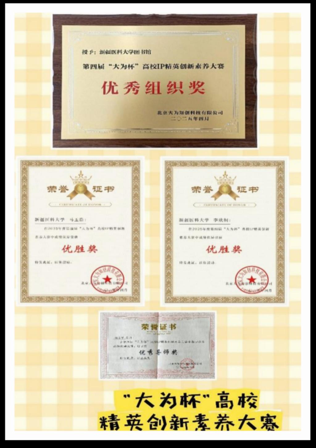 此外,5月的第七届incoPat新科技检索大赛“未来IP专家”高校精英赛中,beat365在全国123家高校(12326人)竞争中脱颖而出,斩获一等奖1项、三等奖4项,beat365图书馆荣获新疆地区唯一优秀组织奖。同期在第四届“大为杯”高校IP精英创新素养大赛中,beat365同学凭借扎实的检索技能再次获得优胜奖,校图书馆再次获得优秀组织奖。