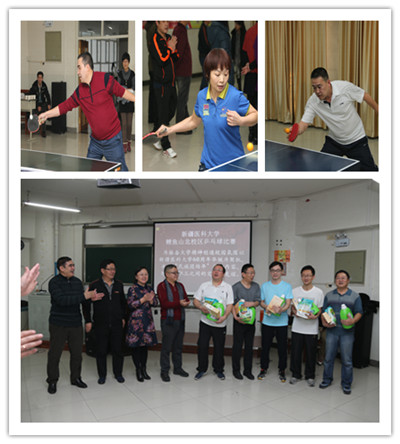 近日,在北校区422室,语言文化学院,维吾尔医学院,工程学院和中医学院共派23名选手(男16人,女7人)报名参加了团体赛和男女单打比赛。选手们个个摩拳擦掌,跃跃欲试。团体赛上工程学院四男一女和语言文化学院二男三女争夺冠亚军,最终工程学院以整体实力出众荣获冠军!团体赛进行地同时,个人赛也在激烈地进行中,女单决赛在维吾尔医学院的黎瑛书记和语言文化学院的练丽娟之间展开,一板板凶狠地扣杀,一个个刁钻的角度,引来场上观众阵阵叫好声。最终黎英荣获冠军,练丽娟荣获亚军,卡力贝荣获第三名。男单的比赛更为激烈,语言文化学院崔巍院长是这次男单夺冠的热门人选,但在比赛中因救球跑动幅度过大拉伤肌肉,只好弃权,最终工程学院刘慧强勇夺男单冠军,中医学院陈晶荣获亚军,中医学院黄熊杰荣获第三名。